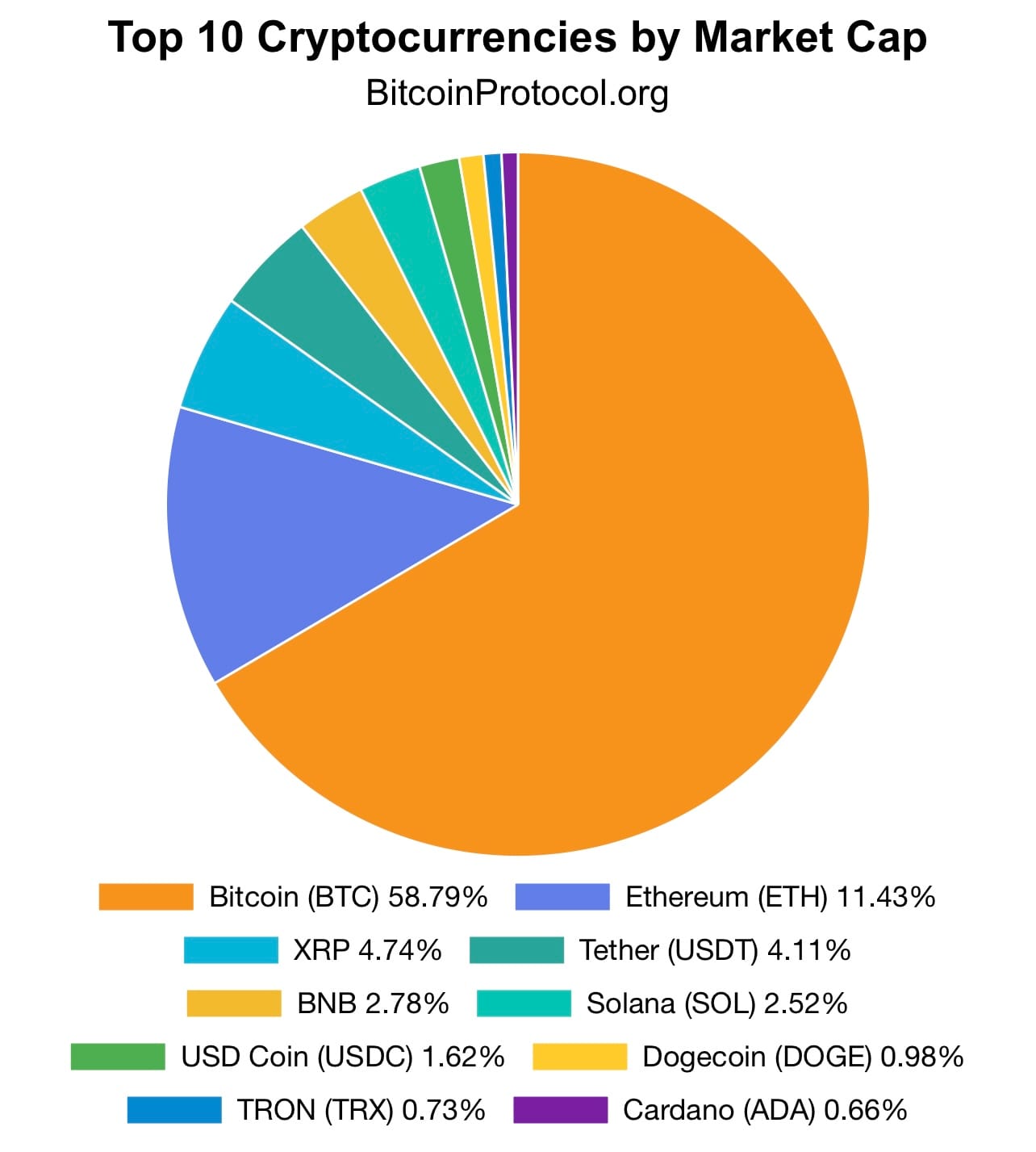 The top 10 cryptocurrencies by market cap further illustrate Bitcoin’s lead, with Ethereum holding a distant second place at 11.43%. Following Ethereum are XRP at 4.74%, Tether at 4.11%, BNB at 2.78%, Solana at 2.52%, USD Coin at 1.62%, Dogecoin at 0.98%, TRON at 0.73%, and Cardano at 0.66%.