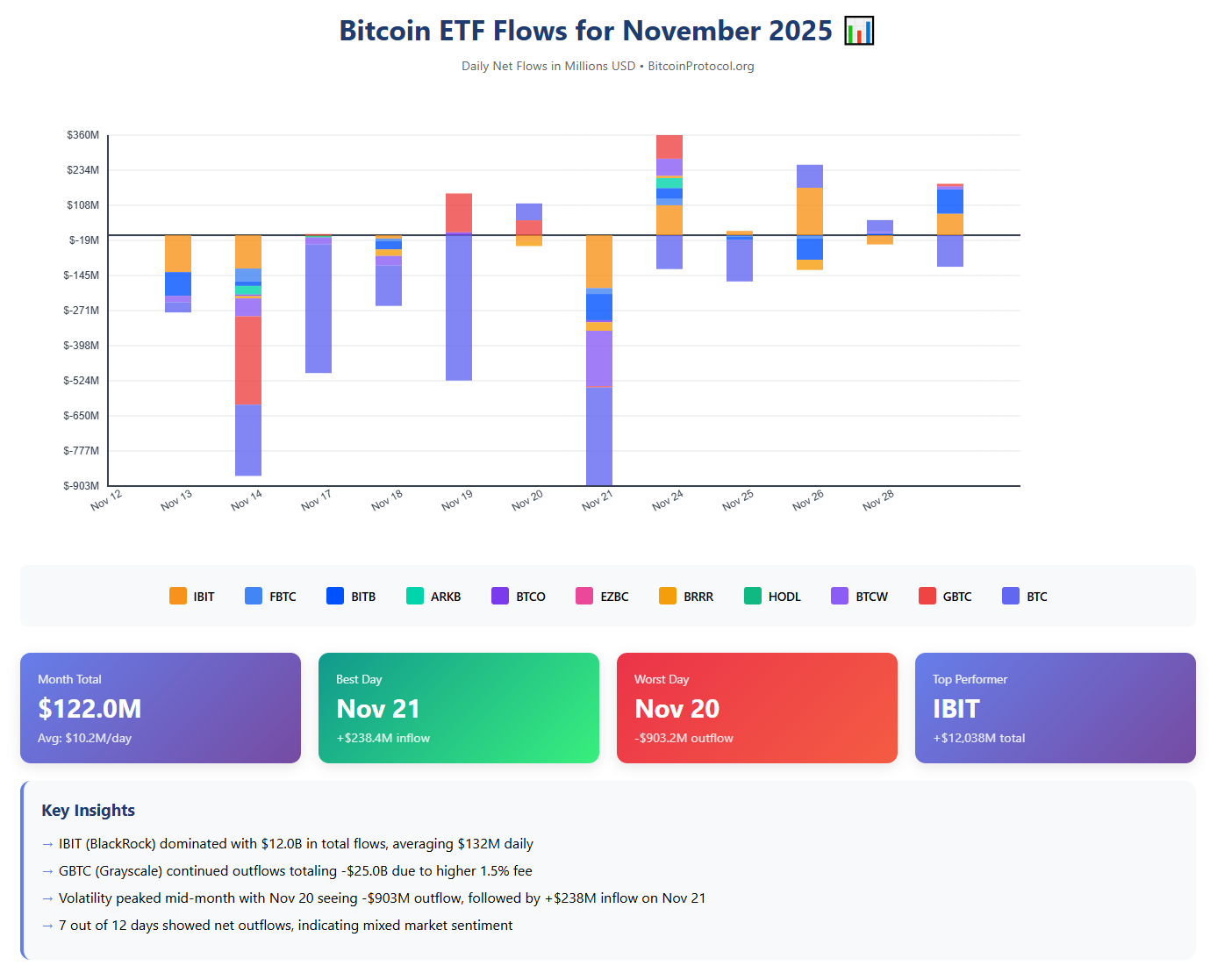 Spot Bitcoin ETFs in the United States recorded net outflows totaling about $3.5 billion for the full month, the largest monthly withdrawal since early 2025. Data from trackers like Farside Investors revealed seven major outflow days that overshadowed smaller inflows, with the heaviest redemptions occurring mid-month. On November 20, for instance, funds saw $903 million in exits, followed by $866 million the previous week, as redemption pressures forced on-chain Bitcoin sales and exacerbated the price drop.