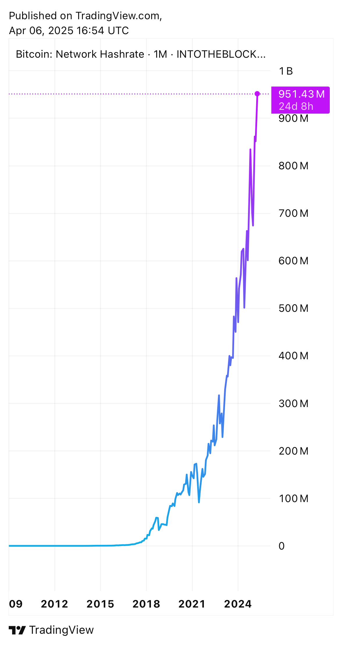 In a significant development, Bitcoin's hashrate has reached an all-time high as of April 2025, signaling robust growth in the network's computational power. This milestone shows the increasing activity and security within the Bitcoin ecosystem. The hashrate, which measures the total computational power used to mine and process transactions on the Bitcoin blockchain, has seen a remarkable upward trajectory since 2015. The hashrate chart shared below illustrates this exponential rise, with a particularly sharp increase in early 2025, pushing the hashrate to unprecedented levels.