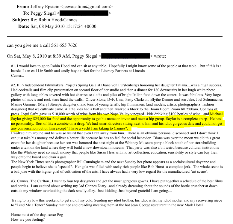 The emails don't shed the best light on Saylor, as one email to Epstein about Saylor, describes him as a "complete creep" who is "sort of like a zombie on a drug."