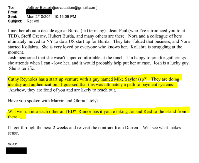 In the email below between Epstein and a redacted name, they discuss Saylor working on a startup about identity and authentication, with a path to payment systems. It also mentions how Epstein is taking Joi Ito and Reid Hoffman, both investors in Blockstream and Bitcoin, to "the island."