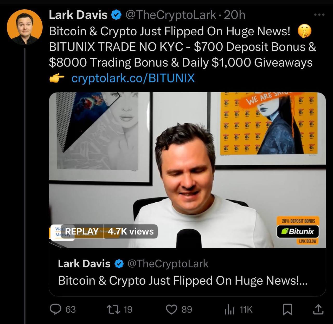 ZachXBT’s alert arrives amid growing scrutiny of high-profile shills in the space. Lark Davis, a well-known crypto commentator who goes by the name Crypto Lark, shared an affiliate link for Bitunix, highlighting its no-KYC trading, deposit bonuses up to $700, trading incentives worth $8,000, and daily giveaways totaling $1,000. This promo (archived) drew immediate backlash, as it spotlights a platform that operates with minimal oversight compared to established players, drawing the ire and scrutiny of ZachXBT.