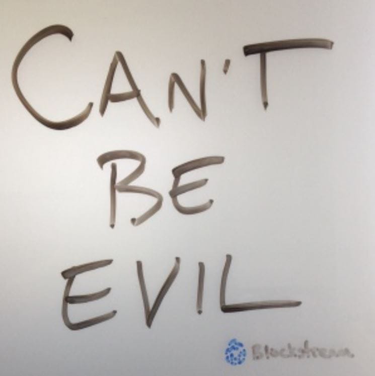 “Can’t be evil.” That was the first thing Adam Back and I wrote on a whiteboard at the start of the year. I had flown out to Malta to spend a week with Adam in a hotel board room to map out a vision for an ecosystem and a future we wanted to see built.