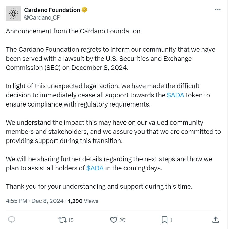 However, the scam didn't stop there. After the initial thread was taken down, the hacker used the Cardano Foundation's account to spread another falsehood, this time about an SEC lawsuit against the organization. The fabricated notice claimed the Foundation had decided to "immediately cease all support towards the $ADA token to ensure compliance with regulatory requirements." This claim was especially poignant, given the ongoing regulatory scrutiny many cryptocurrencies face, potentially causing panic among investors and ADA holders.