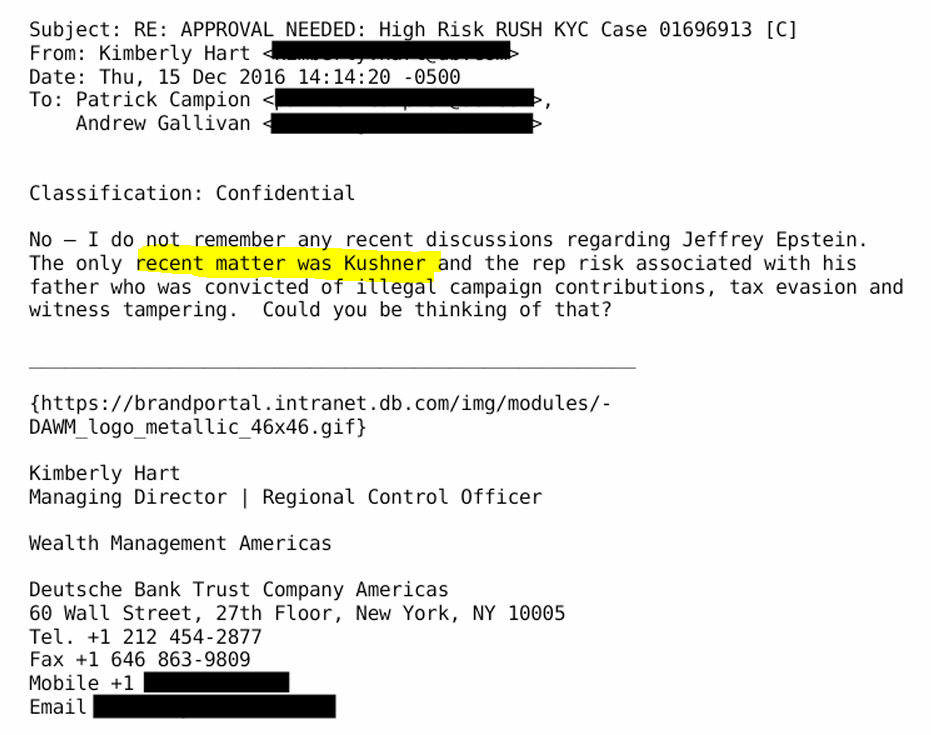 - A bank that kept Jeffrey Epstein as a client while discussing Kushner in the same risk context.