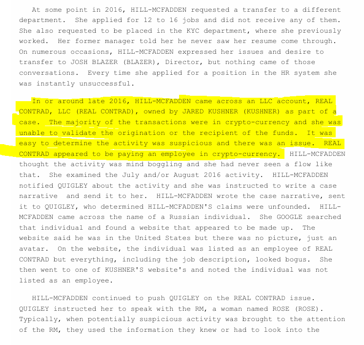 In late 2016, Deutsche Bank anti‑money‑laundering officer Tammy Hill‑McFadden stumbled onto something she had never seen before. As she told the FBI in 2019, she was reviewing a case when she discovered an account belonging to REAL CONTRAD, LLC, an entity owned by Jared Kushner.