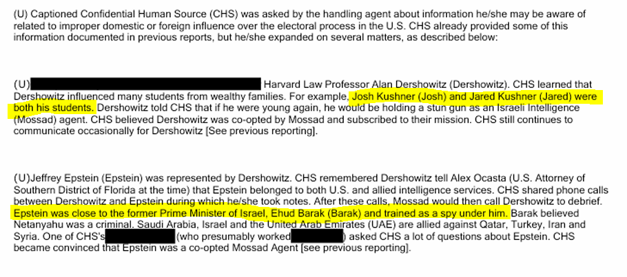 "Harvard Law Professor Alan Dershowitz (Dershowitz). CHS learned that Dershowitz influenced many students from wealthy families. For example. Josh Kushner (Josh) and Jared Kushner (Jared) were both his students. Dershowitz told CHS that if he were young again, he would be holding a stun gun as an Israeli Intelligence (Mossad) agent. CHS believed Dershowitz was co-opted by Mossad and subscribed to their mission. CHS still continues to communicate occasionally for Dershowitz."