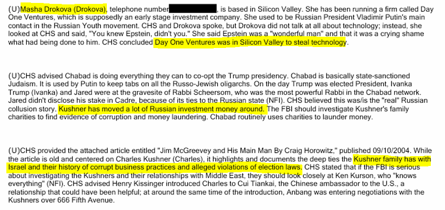 - An intelligence source alleging that Kushner’s financial networks intersect with Russian‑linked capital and Chabad‑connected donors.