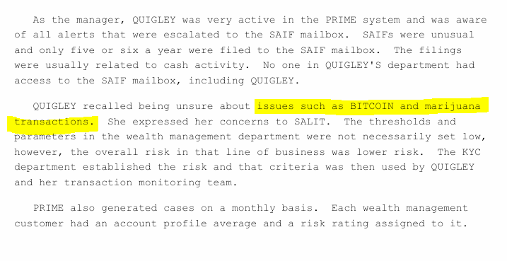 In the conversation with the FBI about suspicious transactions, she said she recalled being unsure about issues such as Bitcoin and marijuana, and reporting parameter thresholds.