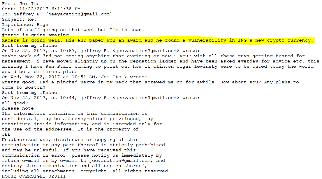 An email dated November 22, 2017 captures casual updates between Ito and Epstein as they planned meetings in Boston. In the 2017 message, Ito notes that Virza is doing well, mentioning his PhD paper award and discovery of a vulnerability in ING's new cryptocurrency.