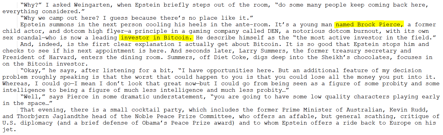 Epstein summons in the next person cooling his heels in the ante-room. It’s a young man named Brock Pierce, a former child actor, and dotcom high flyer—a principle in a gaming company called DEN, a notorious dotcom burnout, with its own sex scandal—who is now a leading investor in Bitcoin. He describe himself as the “the most active investor in the field.”