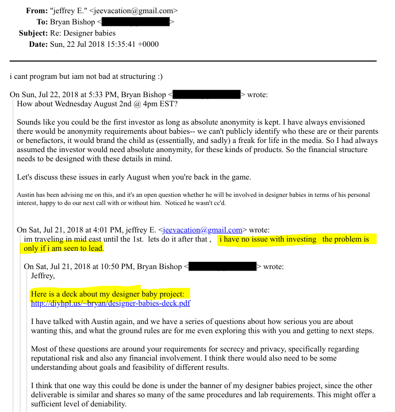Bishop sought up to $9.5 million over five years to move beyond "self-funded garage biology." Epstein responded positively but insisted on anonymity: "I have no issues with investing. The problem is only if I am seen to lead." Bishop also mentions Austin Hill, saying he is advising him, and "it's an open question whether he will be involved in designer babies in terms of his personal interest."
