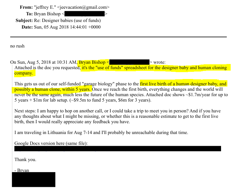 By mid-2018, the conversation shifted dramatically. Bishop, a self-described transhumanist interested in overcoming human biological limits, pitched Epstein on funding a venture to genetically enhance human offspring, potentially leading to the "first live birth of a human designer baby and possibly a human clone" within five years.