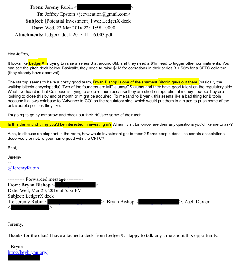 In 2015-2016 emails, Rubin introduced Epstein to LedgerX, a cryptocurrency derivatives platform co-founded by Paul and Juthica Chou, where Bishop had worked as an engineer. LedgerX aimed to become the first regulated Bitcoin options and futures trading platform under CFTC oversight.