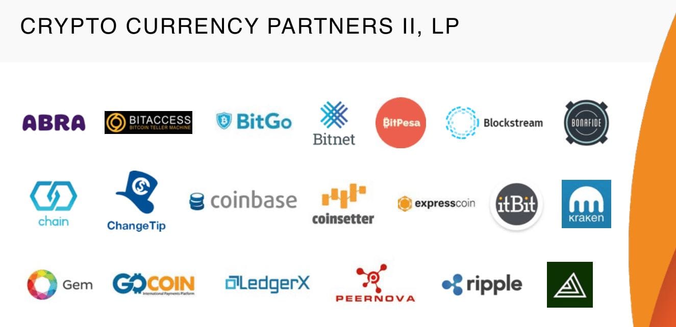 By October 2015, CCP II was already deploying capital. An investor update from that period lists a who's who of Bitcoin's foundational players: