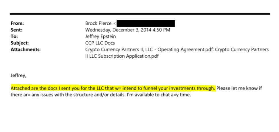 Buried in the documents are emails and legal filings from 2014 to 2018 revealing that Epstein didn't just dabble in Bitcoin, he poured millions into it through a bespoke investment vehicle designed to keep his name off the books. At the center of it all is Brock Pierce, the former child actor turned crypto evangelist, and his firm Blockchain Capital. This wasn't casual investing. It was a meticulously structured "funnel" to channel Epstein's cash into the nascent Bitcoin and blockchain ecosystem; companies that would later become well known names in the space.
