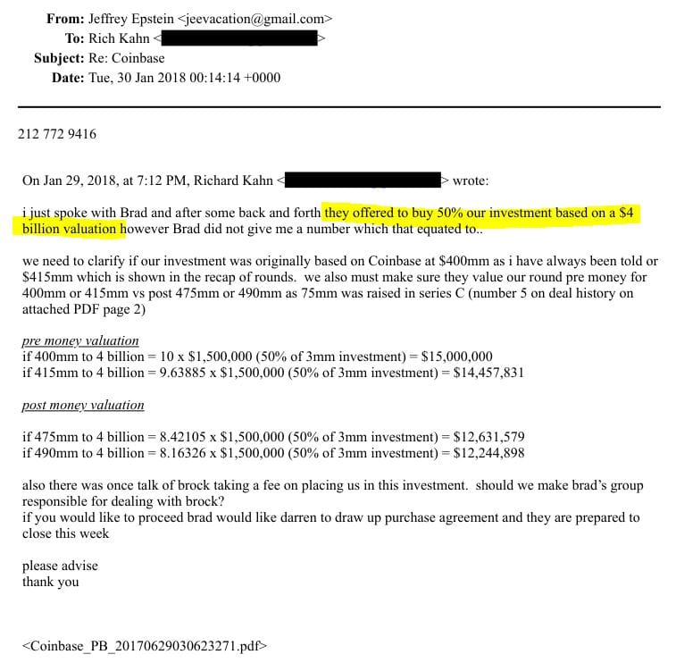 One email from Richard Kahn to Epstein summed it up: "We need to clarify if our investment was originally based on Coinbase at $400mm... also there was once talk of Brock taking a fee on placing us in this investment."