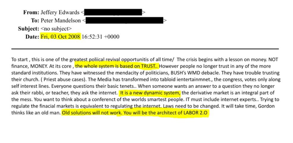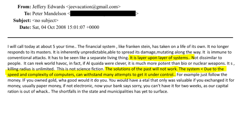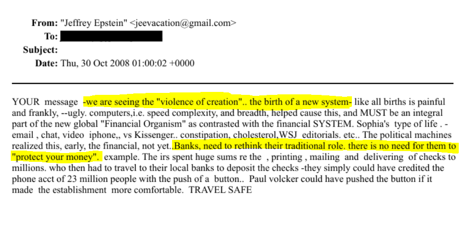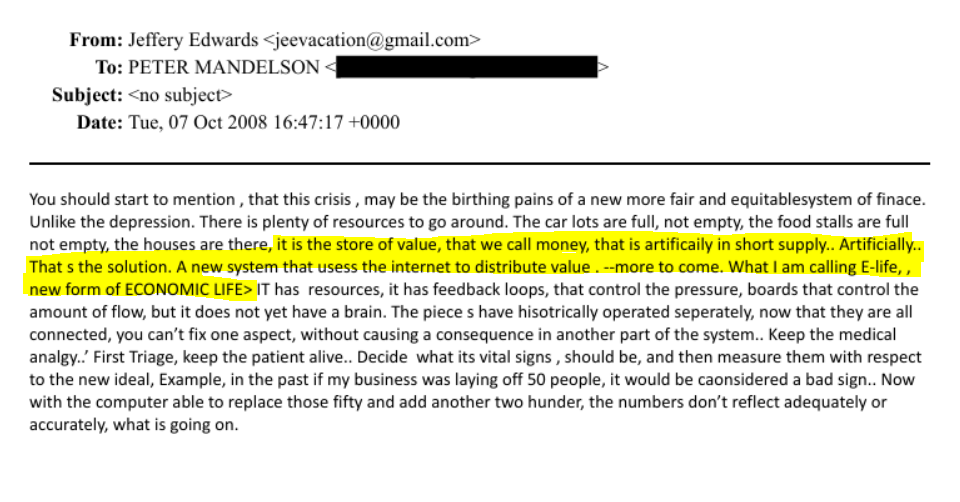 Epstein, meanwhile, was no stranger to high finance. As a money manager for the ultra-wealthy, he understood "store of value" concepts deeply, gold, assets, currencies, and the history of money. His emails from this period reveal him brainstorming a "new system" amid the crisis, drawing on internet tech, feedback loops, and organic analogies.