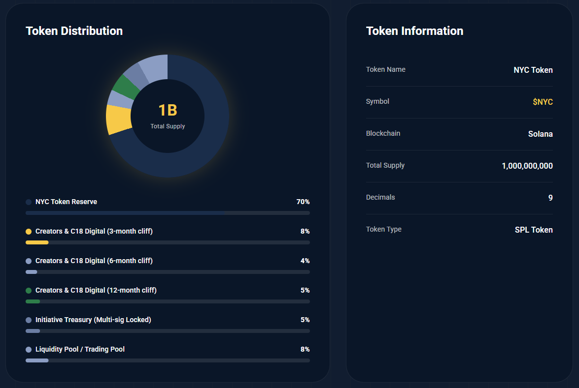 The token's official website BuyNYCToken.com outlines a total supply of one billion coins, allocating 70% to a reserve that does not count toward circulating supply. Adams mentioned plans to direct generated funds toward combating antisemitism and anti-American sentiments globally. Yet, he offered few details on the identities of any co-founders or the precise mechanisms for handling and distributing those funds.