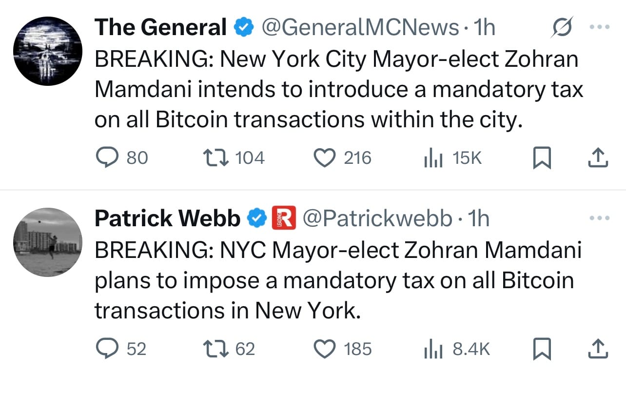 New York City voters ushered in a new era when Zohran Mamdani secured a narrow victory in the mayoral election, promising progressive reforms to tackle affordability and equity. The Democratic Socialist’s campaign emphasized bold investments in public services, drawing strong support from younger demographics and labor unions across the boroughs. Yet a new fake news claim about taxing Bitcoin transactions surfaced on X today, casting an unwanted shadow over his election win and stirring alarm in the crypto space.