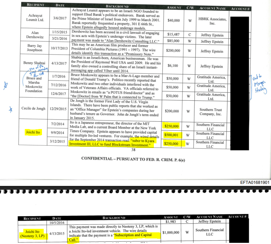 Earlier reporting established that Epstein’s MIT donations were quietly funneled into DCI. These newly surfaced financial records strengthen that connection: the money didn’t just pass through MIT, it passed through Ito’s venture structures, the same structures tied to the Blockstream investment.
