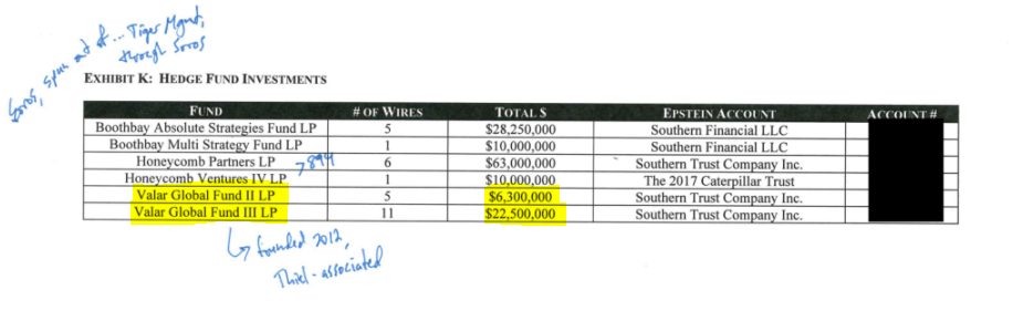 The document also lists $28.8 million in commitments to Valar Global Fund II and III, routed through Southern Trust Company. Valar Ventures, managed by Peter Thiel, later became a major investor in crypto platforms such as Bitpanda, Vauld, and One Trading. Combined, Velar Ventures invested hundreds of millions into crypto startups, but Epstein's money was just a portion of that initial funding.
