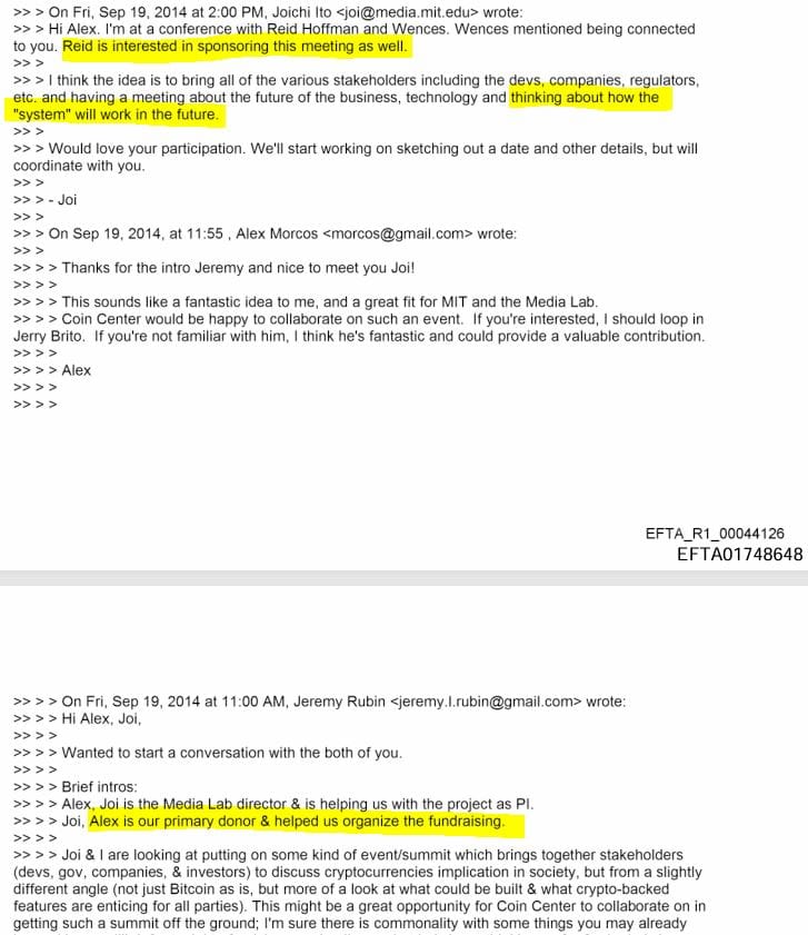 In September 2014, Rubin intro's Joi Ito and Alex Morcos from Chaincode, writing "Alex is our primary donor & helped us organize the fundraising," including Epstein on the emails. In a direct follow up email, Joi Ito writes that Reid Hoffman is interested as well, and how they all are "thinking about how the [Bitcoin] "system" will work in the future."