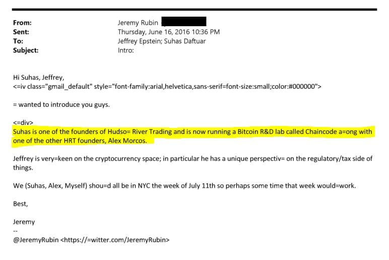 These aren't casual pings. The 2016 intro explicitly spotlights Chaincode as Daftuar's brainchild, tying Epstein's "regulatory/tax expertise" to Bitcoin's growing pains. Did the July meeting happen? The trail goes cold; no follow-ups in the files, no public records. But Rubin's later admissions confirm in-person Epstein chats on Bitcoin regs, and Daftuar's tax input shows real collaboration. Ethically murky?