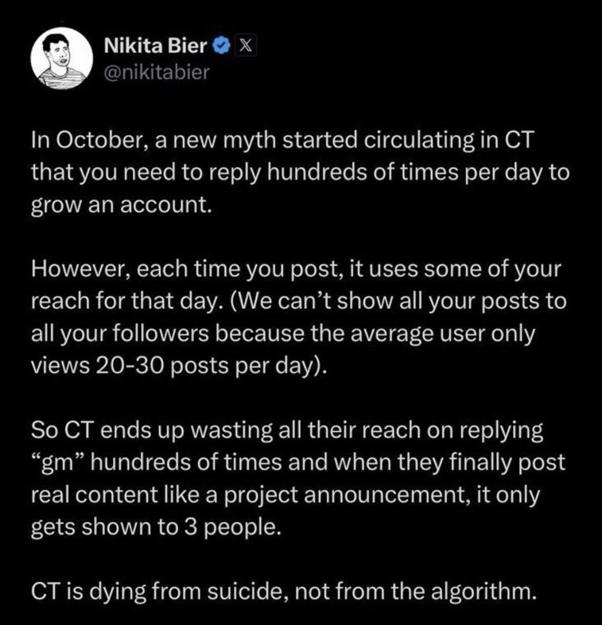 The controversy ignited when Bier shared observations about posting habits in Crypto Twitter, pointing out that repetitive replies, such as hundreds of daily "GM" (good morning) messages, were exhausting a limited daily reach budget and burying higher-quality content. He emphasized that this behavior was reducing visibility for meaningful announcements, sometimes limiting them to just a handful of views. The thread, which drew swift and heated responses, was subsequently deleted by Bier, further fueling accusations of avoidance.