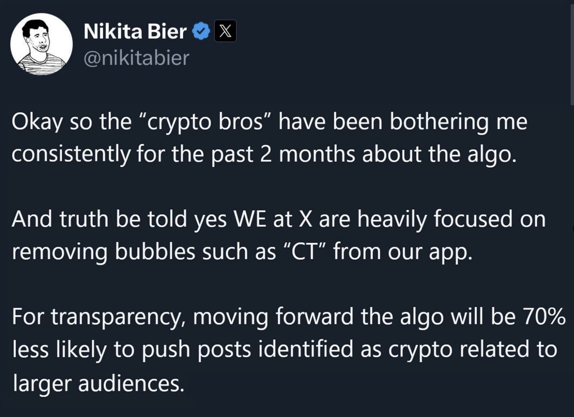 In addition, Bier made more posts such as the one below, saying "And truth be told yes WE at X are heavily focused on removing bubbles such as "CT" from our app. For transparency, moving forward the algo will be 70% less likely to push posts identified as crypto related to larger audiences." This post really lit the fire under Crypto Twitter users, who amped up the backlash.