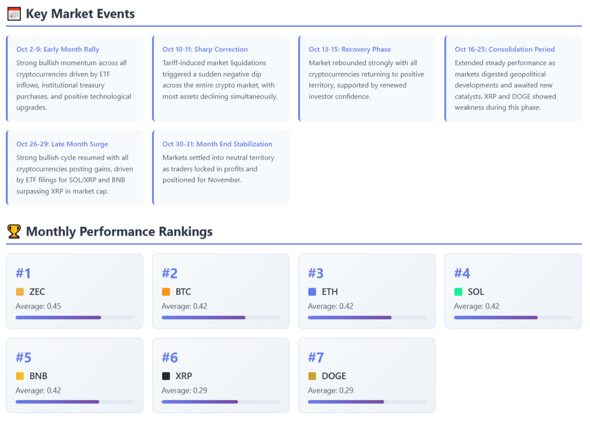 The crypto sector navigated a turbulent October 2025 with a blend of setbacks and recoveries that underscored its maturing landscape. Bitcoin stood firm as the sector's anchor, buoyed by steady institutional investments and evolving exchange-traded fund strategies. Altcoins presented a varied picture, where gains in some areas offset losses elsewhere amid broader economic pressures.