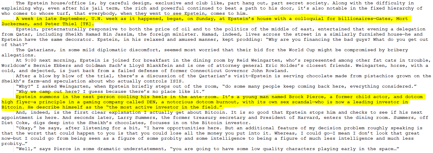 By September 2014, Thiel's path crossed with Epstein's. Scheduling records from Epstein's estate, now public in the 2025 release, show at least three meetings between the two that month, often at Epstein's opulent Manhattan townhouse. These encounters included one-on-one sessions, lunches, or dinners, some marked as tentative. While exact agendas aren't detailed, an unpublished draft article from New York Magazine, attached to a March 2015 fact-checking email in the dump, references Thiel's presence at Epstein's 2014 gatherings, specifically, a Sunday night discussion during U.N. Week in late September involving Bill Gates and Mort Zuckerman. The draft describes Epstein's townhouse as a hub for elite networking, naming Thiel alongside figures like Gates and Larry Summers, though it doesn't tie Thiel specifically to any crypto talks. Instead, it pivots to a separate Bitcoin discussion involving Brock Pierce (described as a "leading investor in Bitcoin") and Summers, which occurred around the same period as Thiel's scheduled visits.