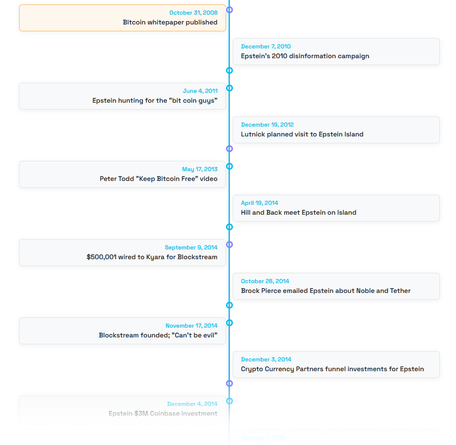 There is a great video by Aaron Day on the Corbett Report which goes down this rabbit hole and covers in great detail the connections to Epstein, the Epstein-Bitcoin timeline, and how it influenced Bitcoin's path to where it is today.