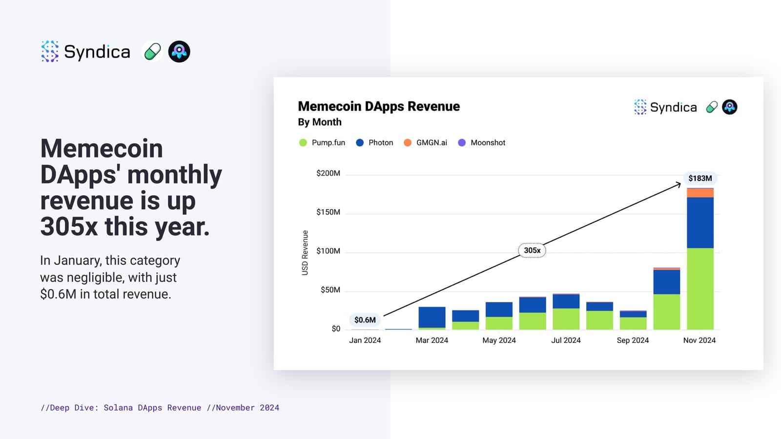 The fascination with meme coins has not only spiked interest but also significantly boosted revenue. Over the year, meme coin dapps have seen an astronomical 305-fold increase in monthly revenue, amassing over $500 million. This growth is epitomized by platforms like Pump.fun, which alone generated $106 million in November, setting a new benchmark for emerging projects on the Solana network.