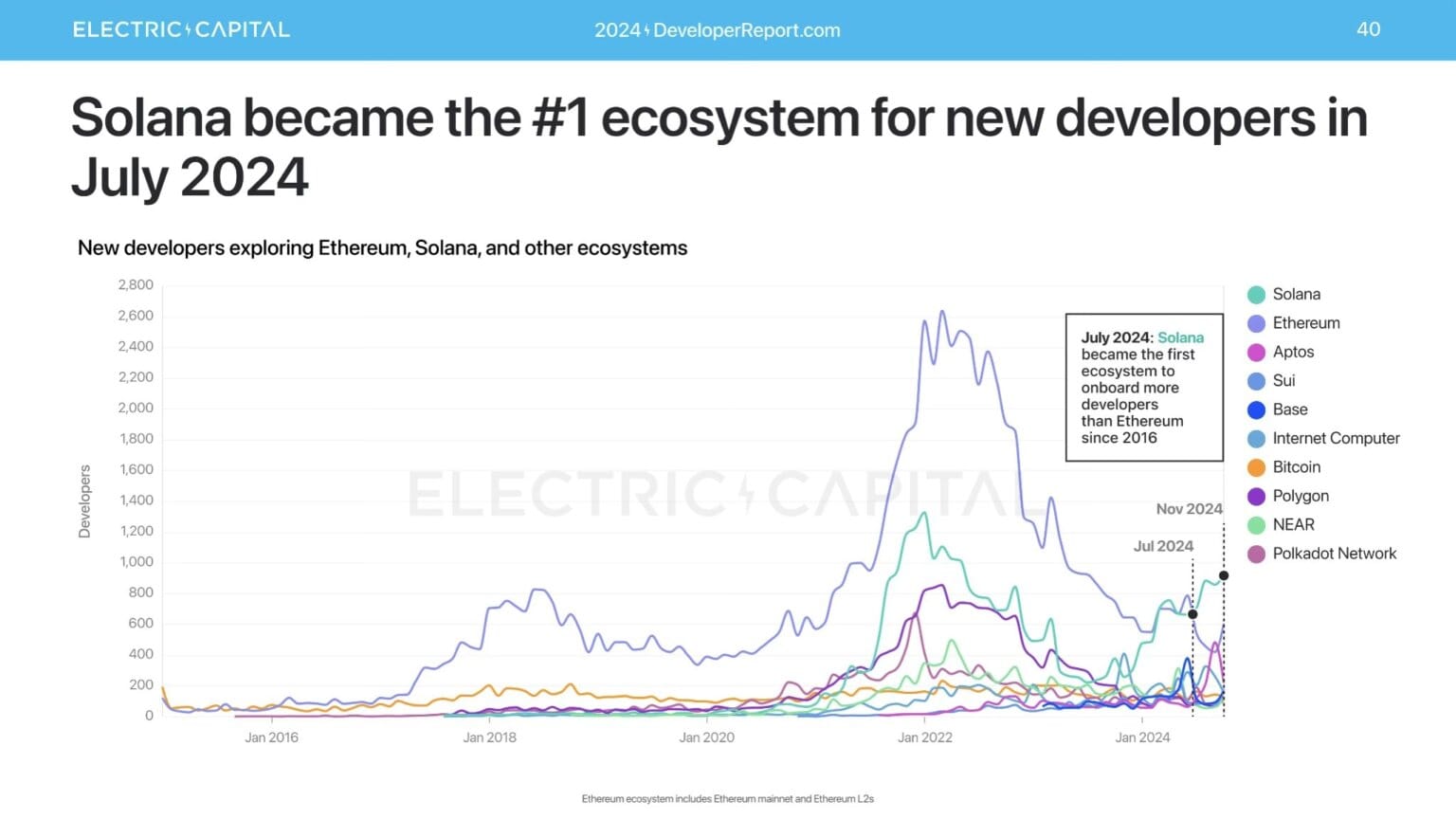 Solana has just pulled off an incredible feat, dethroning Ethereum as the most attractive blockchain for new developers after nearly a decade of undisputed dominance. A recent study by Electric Capital reveals that Solana has welcomed 7,625 new developers into its fold in the last year alone, marking the first time any blockchain has outshined Ethereum in developer growth since 2016.