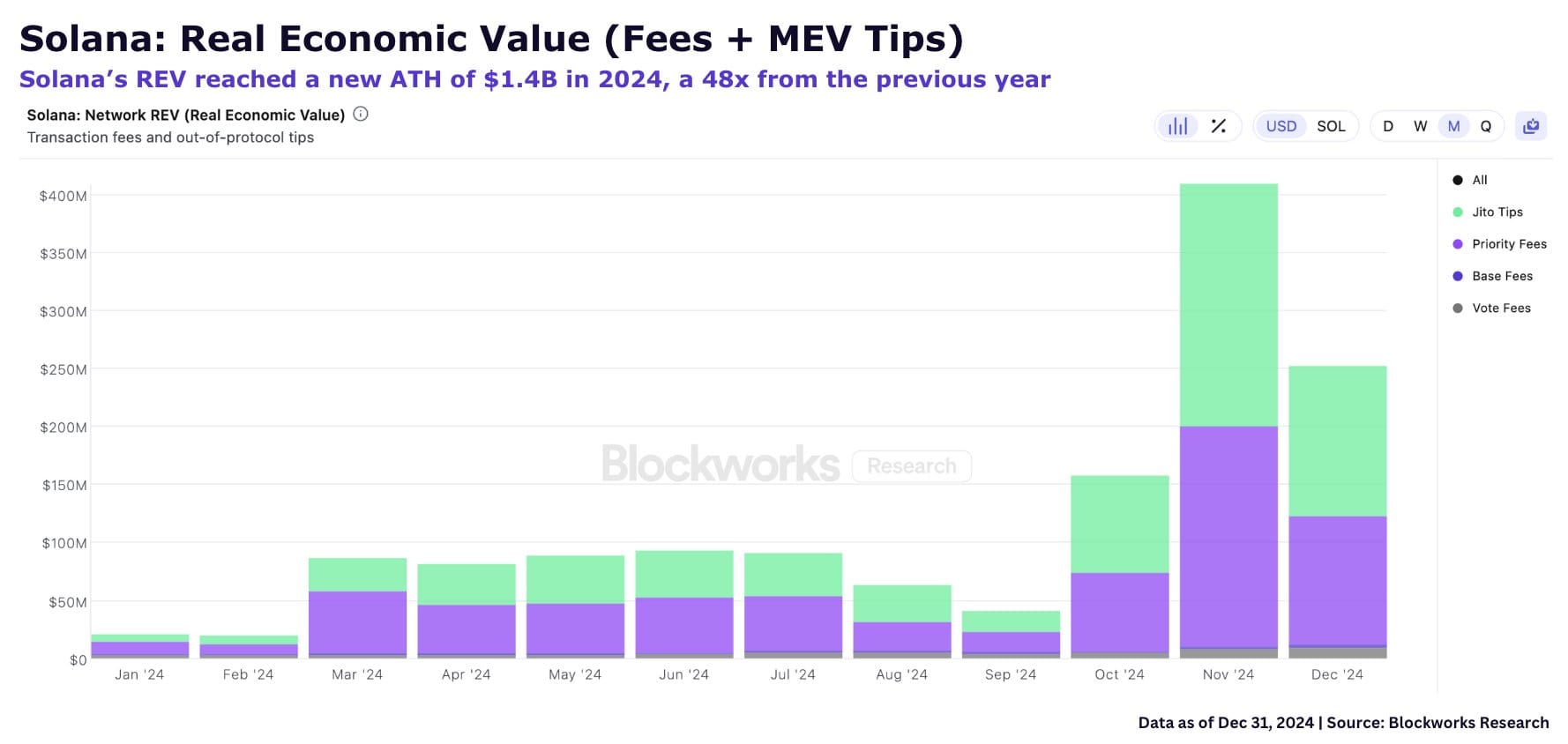 Financially, Solana's performance in 2024 was stellar, with its Real Economic Value (REV) reaching a new peak at $1.4 billion. This figure, which includes both transaction fees and MEV tips, highlights the economic activity buzzing within the Solana network. Jito tips and priority fees from trading activities alone account for a substantial part of this revenue, showcasing Solana's pivotal role in the DeFi space. With a 39% share in global REV, Solana has not only caught up with but surpassed many of its peers, demonstrating a clear demand for its blockchain solutions.
