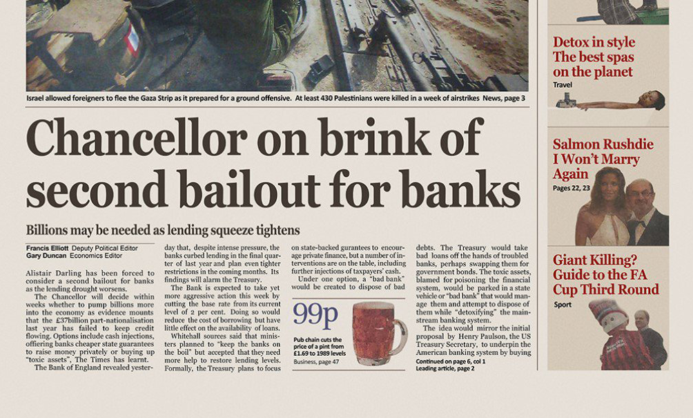 "The Times 03/Jan/2009 Chancellor on brink of second bailout for banks"