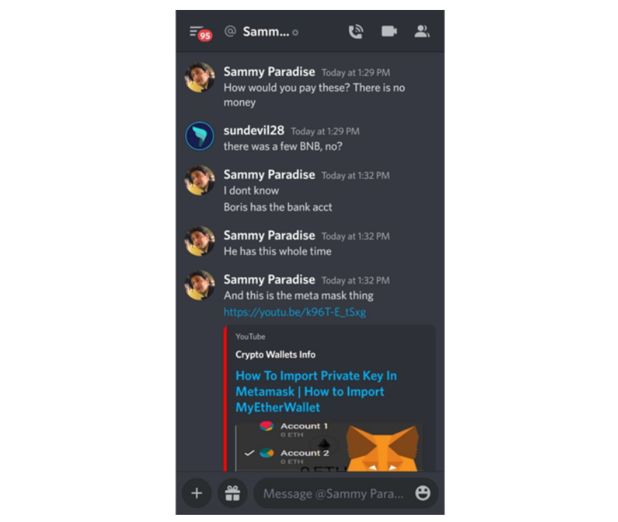 In one message exchange, lawsuit defendant Grant Tragni who went by the online username "Sammy Paradise", said that "How would you pay these? There is no money." When asked if there was still BNB left, he replied, "I don't know, Boris has the bank acct."