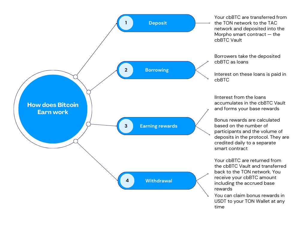 The Bitcoin specific offering called Bitcoin Earn centers on cbBTC, an Ethereum based ERC-20 token issued by Coinbase and backed one to one by actual Bitcoin reserves held in custody. Through the TAC infrastructure this wrapped asset gains compatibility for smart contracts and decentralized applications on the TON network. Bitcoin Earn operates as a DeFi protocol from Morpho and appears directly in the TON Wallet interface so users never need to leave the app.