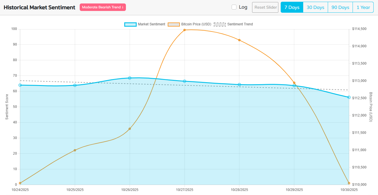 Bitcoin's movements have grown increasingly synchronized with major stock indices, such as the Nasdaq-100, which has shown signs of fatigue amid tech sector headwinds. As equities soften, the knock-on effect pulls digital assets lower, reinforcing a pattern where crypto mirrors broader sentiment rather than decoupling as some had hoped. The crypto market sentiment analysis, a barometer of trader psychology, currently reads 63 in the positive zone for today's sentiment, however with a trending sentiment of 'Moderate Bearish Trend' for the past week, indicating that the overall crypto sentiment has been negative. If you click on the '30 Days' button, the trend changes to 'Strong Bearish Trend' indicating an even more negative trend in the crypto markets recently.