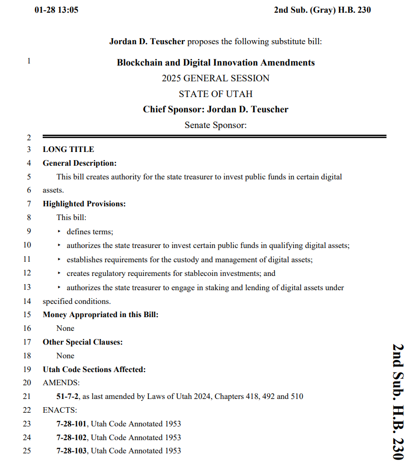 The bill, introduced by Utah Representative Jordan Teuscher on January 21, grants the state's treasurer the power to allocate up to 5% of specific public funds into "qualifying digital assets." These assets include cryptocurrencies with a market cap exceeding $500 billion and certain approved stablecoins. A revised version of the bill, released on January 28, also includes new stipulations regarding zoning restrictions for crypto mining, aiming to regulate this developing sector more effectively.